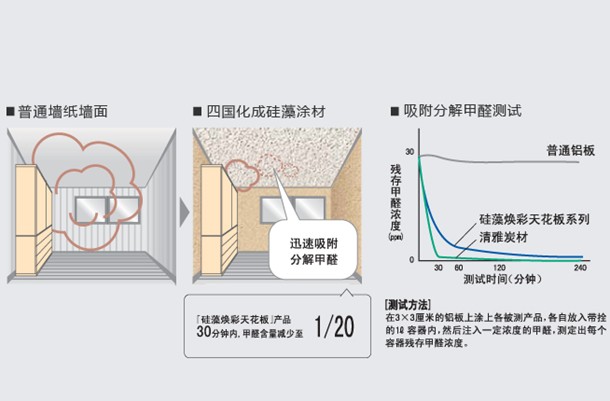 经测试,利用四国化成原装进口硅藻泥装修的房间,在装修之后24小时无忧入住,四国化成进口硅藻泥能够在24小时全面消除室内装修空气中的甲醛、苯等有害气体。家庭装修10倍污染含量的有害气体能够在48小时内清除。甲醛消除率高达95%以上,抑菌率高达96%以上,异味吸收分解率高达90%。