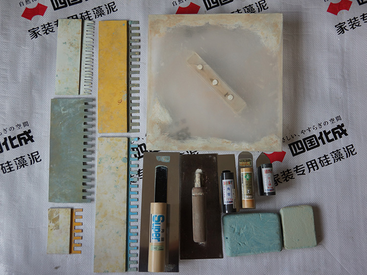 把硅藻泥干粉浸泡在搅拌容器施工用水量的90%,搅匀20分钟后加入另外10%的清水就可以使用了,硅藻泥分两边涂抹,第一版厚度约为1.5mm过50分钟后继续涂抹第二遍厚度为1.5mm,之后用抹刀收光,然后用工具制作图案,图案制作时间较长,部分图案在完成后需要再次收光。