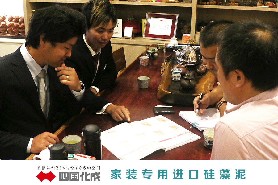 2016年10月24日上午,四国化成硅藻泥日本总部高级技师行方大贵携优秀技师代表一行,参观访问了四国化成中国总代理科甸壁坊总部。科甸壁坊总经理朱朝林先生热情接待行方大贵等人,就室内装修的地面基材,阴阳角的处理方式,以及硅藻泥新花型的创新进行了交流探讨,双方互通意见,针对相关的专业性的装修问题展开了积极的讨论交流。